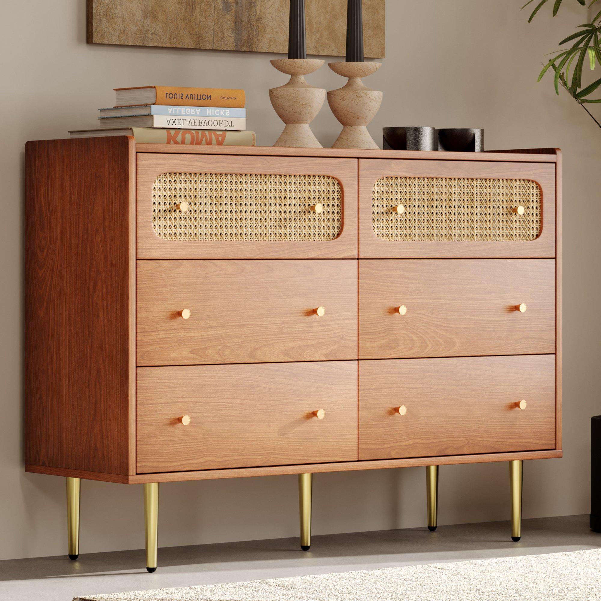 specificationTotal dimensions: 47.2"H × 15.75"W × 35.43"DProduct net weight: 96 lbsProduct gross weight: 101 lbsPackage Size: 55" L× 19.68"W ×7.5" DfeaturesProduct color: walnut + cherryMain material: melamine boardProduct Features:1. The chest of drawers with 6 drawers is decorated with beautiful walnut wood for a flawless and retro appearance.2. Six functional drawers with an internal volume of H11.5 / W33.5 / D52.5 cm, 2 of which are equipped with breathable perforated rattan lids.3. This cabinet has rounded corners, which is very convenient for families with small children. The side walls of the cabinet body are arc-shaped throughout.4. High-quality materials keep you away from chemical odors. The combination of thickened plates and metal feet significantly increases the stability of the product.The 5.20 cm high feet bring you closer to your product for everyday storage. There is no annoying dust under the chest of drawers.Stain resistance: YesassembleAssembly required: YesWe provide detailed installation instructions.ensureProduct warranty: 2 years