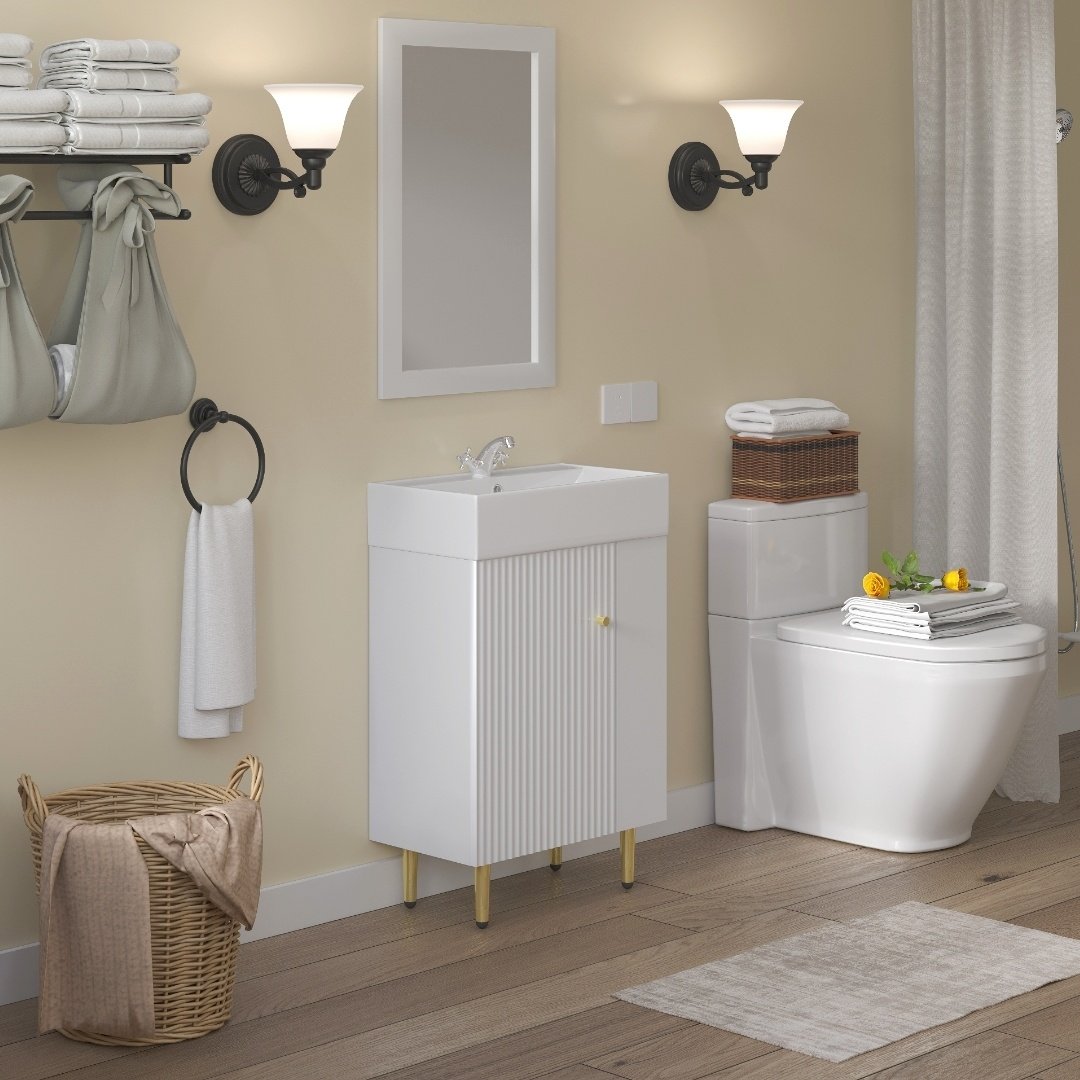 Contemporary Elegance: Elevate your bathroom with this compact vanity and sink set. Featuring clean lines, a wave-pattern cabinet door, and delicate brushed copper accents, this bathroom vanity adds both style and value to your home.